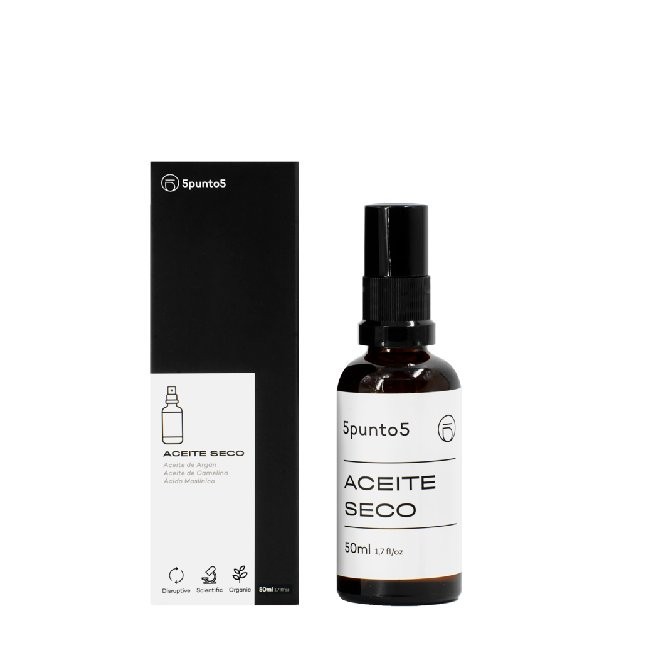 5PUNTO5Este aceite seco, mezcla de ácido maslínico, vitamina E y una selección de cinco aceites vegetales específicos (de primera presión en frío) para la piel y el cabello, hidrata, repara y nutre, absorbiéndose rápidamente, dejando en la piel una sensación de suavidad.