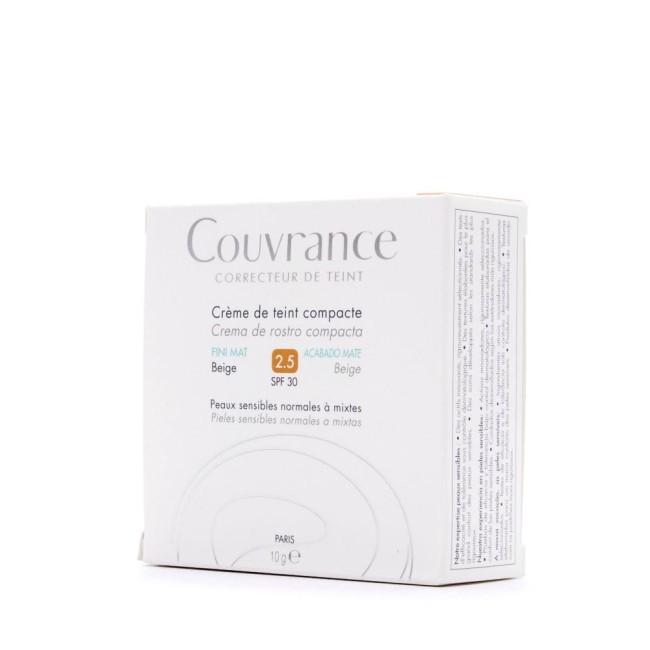 Avene Couvrance Crema de Rostro Compacta Beige Mate SPF 30 Corrige las imperfecciones cutáneas severas y unifica el tono de las pieles claras. Sin perfume, sin conservantes. Sin parabenos. SEIS TONOS Porcelana (1.0), Natural (2.0), Beige (2.5), Arena (3.0), Miel (4.0) y Bronceado (5.0) para adaptarse a las pieles claras. NUEVA TEXTURA Fina y flexible de fácil aplicación gracias a la esponja micro-texturizada de alta tolerancia. Consigue un resultado más leve y natural LARGA DURACIÓN Resistente al agua-, sudor- y transferencia-. Sistema fotoprotector SPF 30 Textura fina y sin efecto mascara. Puede ser usado sólo o en conjunto con productos correctores por color.