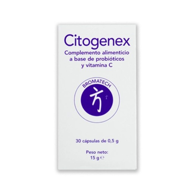 Citogenex es un complemento probiótico formulado por Bromatech que incluye una combinación de lactobacilos (Lactobacillus casei, Lactobacillus acidophilus), bifidobacterias (Bifidobacterium lactis), β-glucanos extraídos de Saccharomyces cerevisiae y vitamina C. Esta formulación está diseñada para mejorar la función de la barrera intestinal y modular la respuesta del sistema inmunitario. La vitamina C contribuye al funcionamiento normal del sistema inmunológico.
