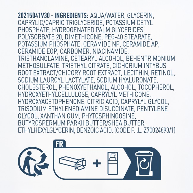 Ingredientes principales traducidos al castellano (orientativo): Agua, Glicerina, Triglicéridos caprílicos/cápricos, Fosfato de cetilo de potasio, Ceramida NP, Ceramida AP, Ceramida EOP, Niacinamida, Retinol, Ácido hialurónico (sodio hialuronato), Extracto de raíz de achicoria, Colesterol, Manteca de karité, Tocopherol (vitamina E) y emulsionantes.