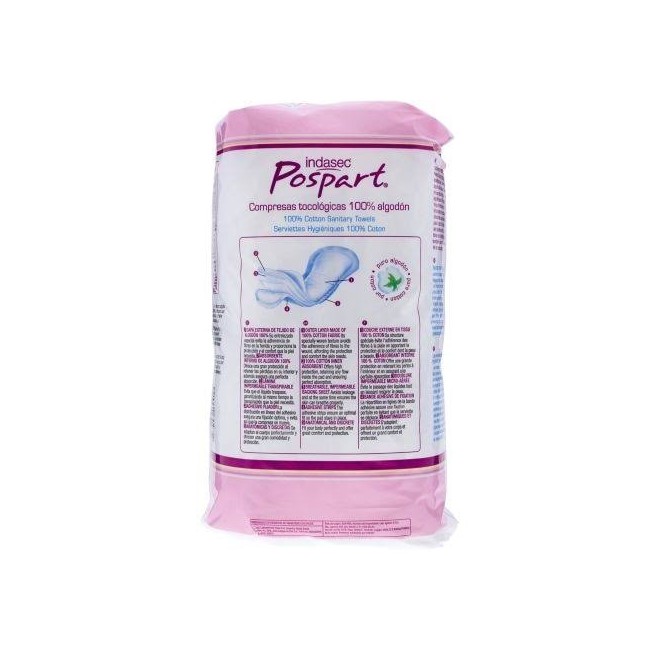 Indasec Compresa Postpart Primeros Días 12uds son compresas que absroben las pérdidas más abundantes desde los primeros días tras el parto. Están creadas con algodón 100% puro para evitar el riesgo de infecciones, irritaciones o alérgias. Tiene un núcleo absorbente compuesto por un entrelazado especial de algodón, que evita la adherencia de fibras en la herida. El algodóon 100% puro es una fibra absorbente, hipoalergénica y permite la transpiración. No altera la mucosa vaginal, evita la humedad y evita la adherencia de fibras en la zona genital favoreciendo la rápidad cicatrización y evitar el riesgo de infecciones.