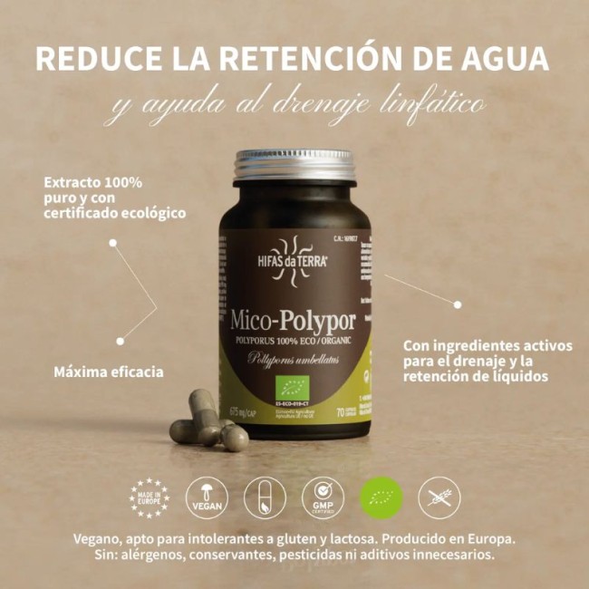 Mico-Polypor es un complemento alimenticio elaborado a partir de extracto ecológico concentrado del hongo medicinal Polyporus umbellatus. Tradicionalmente utilizado por su acción drenante y reguladora del equilibrio hídrico, este hongo es especialmente útil para apoyar la función renal, favorecer la eliminación de líquidos y contribuir al bienestar del sistema urinario.