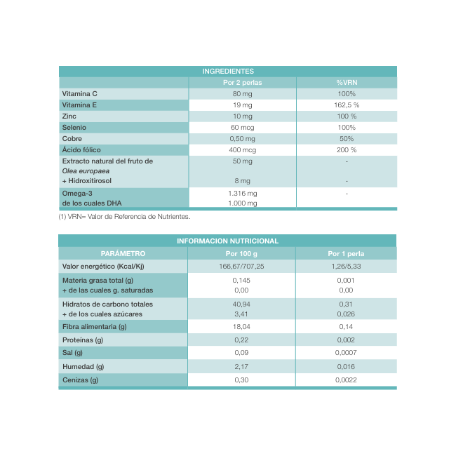 - NuaDHA (aceite purificado procedente de pescado rico en DHA): 1.316 mg