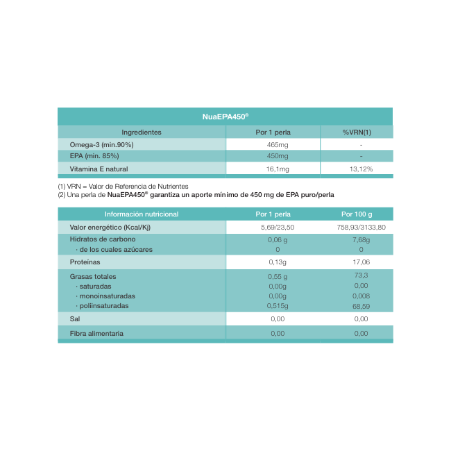 Es un complemento alimenticio que proporciona una alta concentración de EPA, un ácido graso omega-3 de origen marino. Cada perla aporta un mínimo de 450 mg de EPA puro, obtenido principalmente de la anchoveta, un pescado azul rico en omega-3. Este suplemento está diseñado para cubrir las deficiencias de EPA en la dieta, especialmente en sociedades industrializadas donde el consumo de pescado azul es limitado. El EPA es reconocido por sus beneficios a nivel cardiovascular, en procesos inflamatorios y en el apoyo a la salud mental.