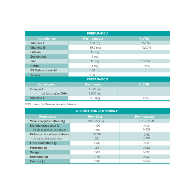 Es un suplemento nutricional diseñado para mantener y mejorar la salud visual en adultos. Su fórmula combina una mezcla de antioxidantes visuales (Preparado A) y un concentrado elevado de DHA (Preparado B), destinado a nutrir y proteger el sistema visual, especialmente en personas con alteraciones visuales o con antecedentes familiares de problemas oculares como degeneración macular, glaucoma o retinopatía diabética.