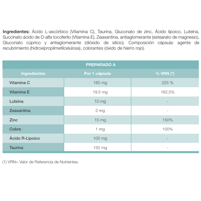 - Zinc (Gluconato de zinc): 15 mg (150% VRN)