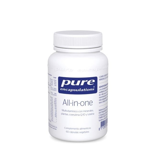 All-in-One de Pure Encapsulations es un suplemento dietético integral que combina 12 vitaminas y 8 minerales altamente biodisponibles, formulado para ofrecer un soporte nutricional completo. Actúa como un multivitamínico y multimineral esencial para el mantenimiento de la salud general, el refuerzo del sistema inmune y la optimización de los niveles de energía. Este producto ha sido cuidadosamente desarrollado para asegurar la máxima absorción y eficacia de sus componentes, lo que lo convierte en una opción ideal para quienes buscan cubrir sus necesidades nutricionales diarias con un solo suplemento.