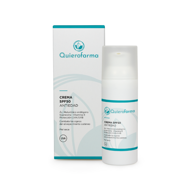 Esta crema no solo ayuda a mantener una piel joven y radiante, sino que también brinda una defensa efectiva contra los rayos solares perjudiciales. ¡Protege y embellece tu piel con Quierofarma Crema Antiedad SPF50+ 50ml!"