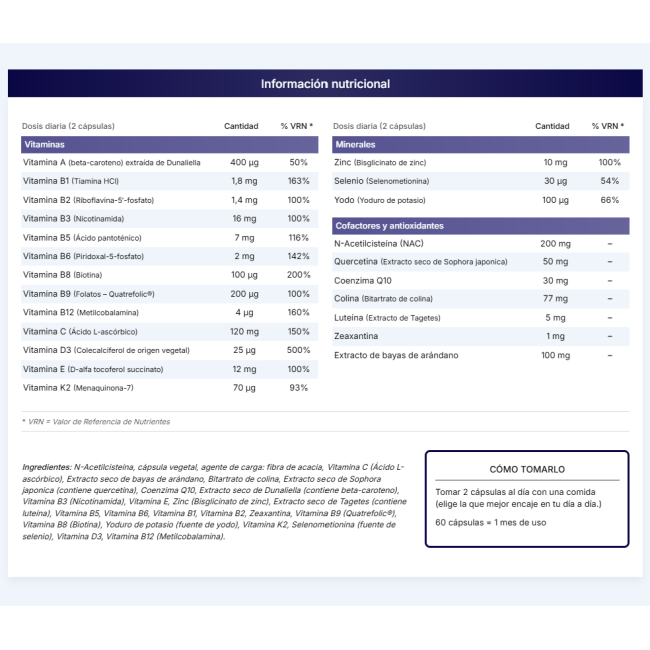 - ¿El cuerpo absorbe todos los componentes a la vez? La fórmula está diseñada para una absorción sinérgica. Las vitaminas solubles en agua se absorben directamente, mientras que las liposolubles (con la comida) y los minerales quelados aseguran una buena asimilación.