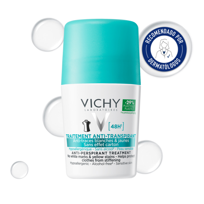 VICHY desodorante antitranspirante 48h roll on cumple todos los requisitos para ofrecerte una protección completa, incluso en aquellas personas cuya transpiración sea intensa.