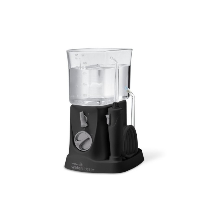 Waterpik Irrigador Traveler WP-300 Black Waterpik Irrigador Traveler WP-300 es el irrigador más compacto de la gama de sobremesa. Elimina de forma eficaz el biofilm oral (placa bacteriana) y está especialmente diseñado para viajar y colocar en espacios reducidos. El irrigador bucal Waterpik Traveler WP-300 es un 50% más pequeño que el resto de irrigadores de sobremesa de la gama Waterpik. El depósito tiene una capacidad de 400 ml, que permite la irrigación bucal durante 60 segundos, e incorpora un sistema de control de presión con tres posiciones. Permite una irrigación fácil y cómoda ya que todos los accesorios rotan 360°. Waterpik Irrigador Traveler WP-300 además, es ideal para viajar ya que incluye un estuche para transportarlo, un adaptador para la corriente, así como selección automática de voltaje. Waterpik Irrigador Traveler WP-300 dispone de los siguientes recambios: boquilla estándar (CN 257202.7), boquilla ortodóntica (CN 257203.4), boquilla Seeker para placa inaccesible (CN 157999.7) y limpiador lingual (CN 305933.6).